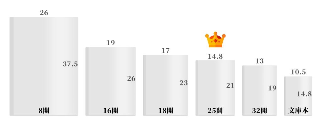 - 8開:26cm×37.5m,B版中的B4尺寸、四六版中的8開。通常作為圖鑑、史料圖錄、繪本所使用的大開本。